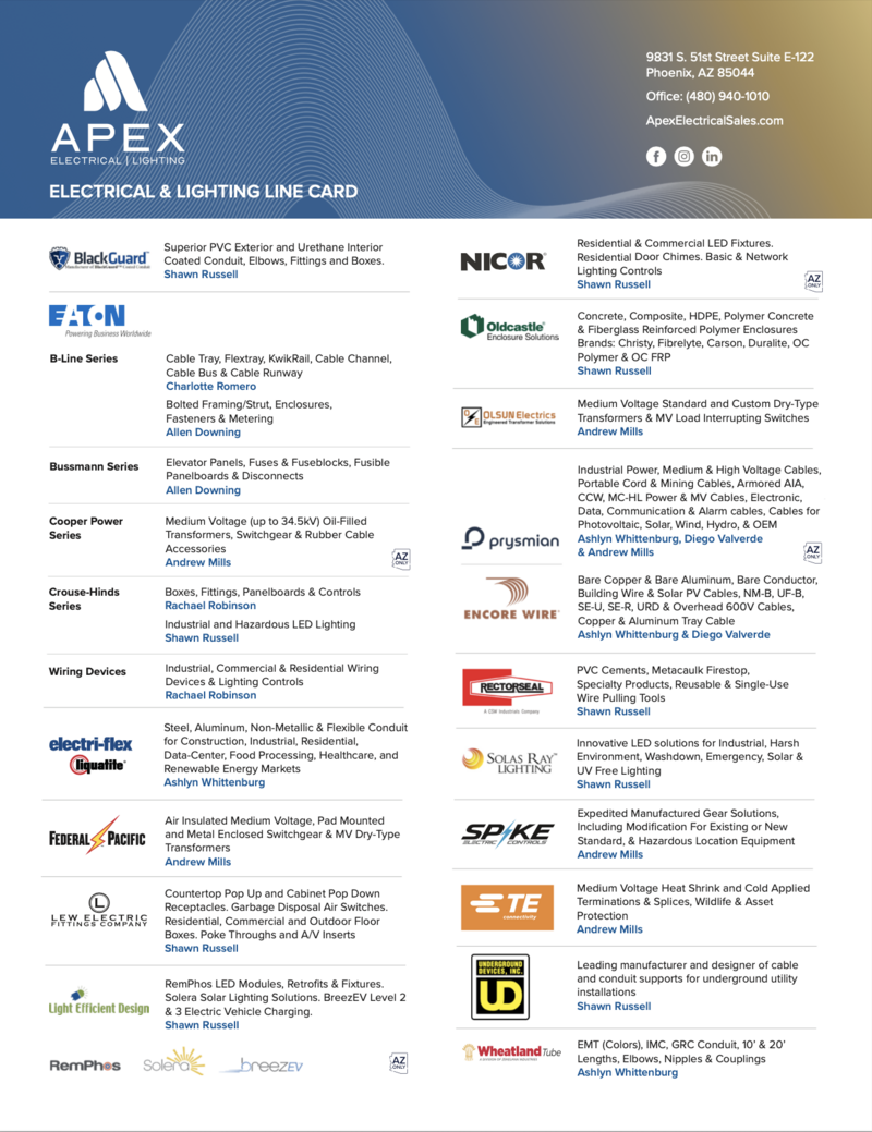 Apex Electrical Sales’ mission is to represent electrical and lighting manufacturers better than any other sales force of its kind in Arizona and Southern Nevada. Our values allow us to take pride at building and maintaining the relationships that make it possible to continually support our purpose.